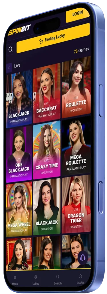 The Live Casino section at online casino SpinBit delivers an authentic experience thanks to more than 70 live games with real dealers, HD video streams and interactive chat options. Games are powered by Evolution Gaming and Pragmatic Play Live, both award-winning providers.