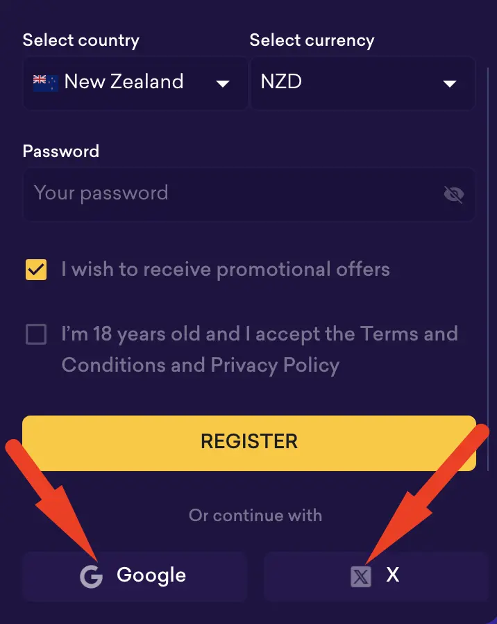 You can also choose whether to receive promotional offers by ticking the optional box. Once everything is filled in, hit Register to complete the process. For even faster access, you can sign up instantly using your Google or X (Twitter) account.