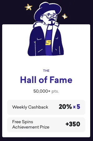 | Hall of Fame | 50,000+ pts | 20% × 5 | +350 spins | — |