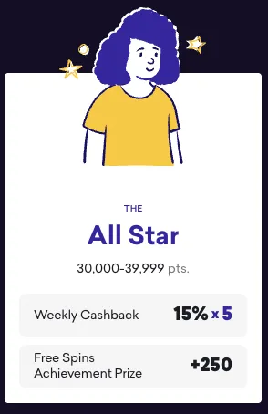 All Stars gain 15% weekly cashback on any losses, allowing you to recoup more of your play budget each week. This gives you greater bankroll reassurance to take more risks playing games.