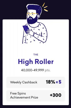 The coveted High Roller status is reserved for VIPs who earn between 40,000 and 49,999 loyalty points. As a High Roller, you qualify for the second-highest 18% weekly cashback rate to cover any losses during the week. When you reach this tier initially, Spin Bit Casino high rollers club gives you an extra 300 free spins to enjoy on any slots.