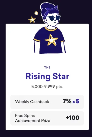 | Rising Star | 5,000 – 9,999 pts | 7% × 5 | +100 spins | — |