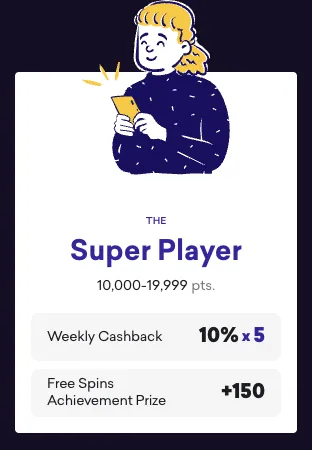 Specifically at SpinBit rewards program, Super Players get 10% cashback on losses each week, allowing you to recoup more of your play so you can keep wagering longer. You also receive a 150 free spin achievement prize as soon as you hit this tier.