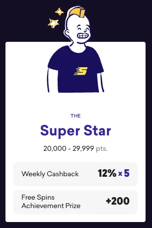 As a Super Star, you now earn 12% weekly cashback on any losses. This allows you greater bankroll flexibility to take more risks playing games, knowing you’ll recoup over 10% of any losing weeks. Super Stars also receive a 200 free spin achievement prize to play more of your favourite games.